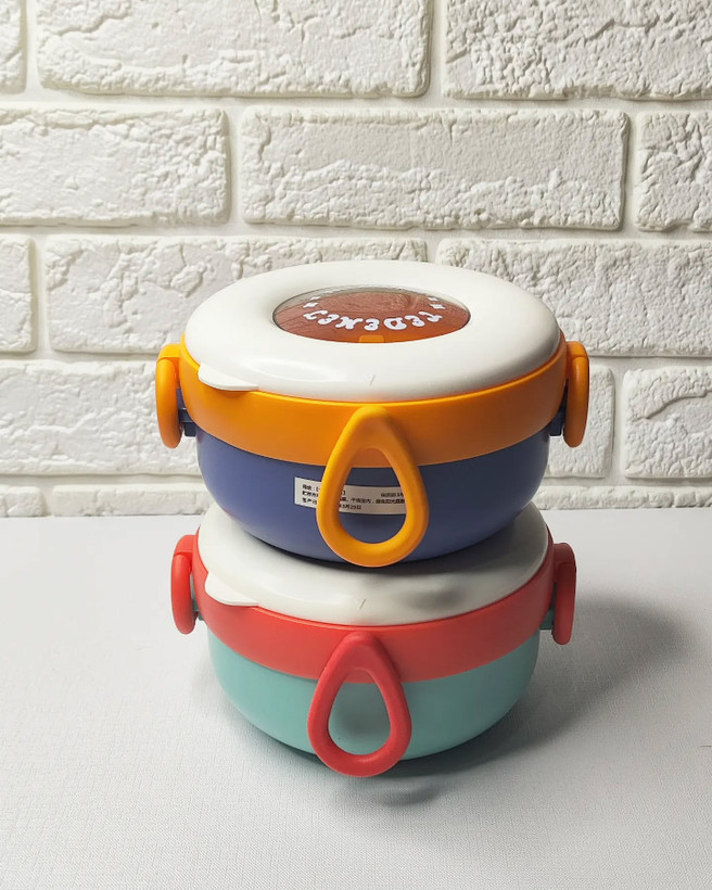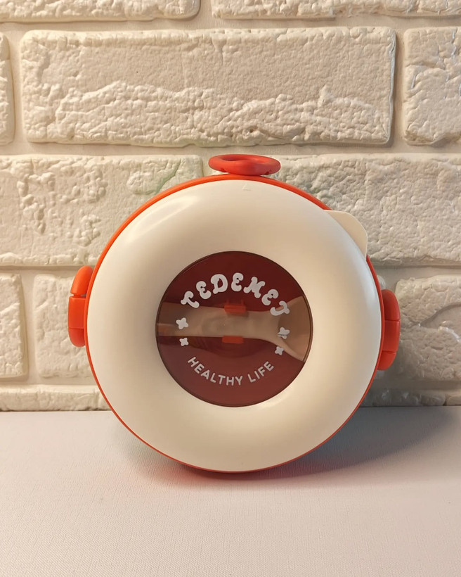 دوتا رنگ محشر داره ک هم مناسب دختره هم پسر لانچ باکس دوناتی کاملا مناسب مهدکودکه قیچی سر گرد کاغذ داره درب ظرف واشر داره و نشتی نداره استیل ۳۰۴ به همراه قاشق میتونید تو ظرف زیری آب جوش بریزید و به راحتی گرمش کنید